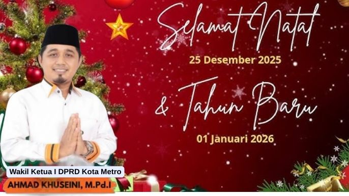 Ahmad Khuseini Wakil Ketua I DPRD Kota Metro Mengucapkan Selamat Hari Raya Natal dan Tahun Baru 2026. Semoga kebahagiaan, kedamaian, dan kasih mengisi hidup Anda…